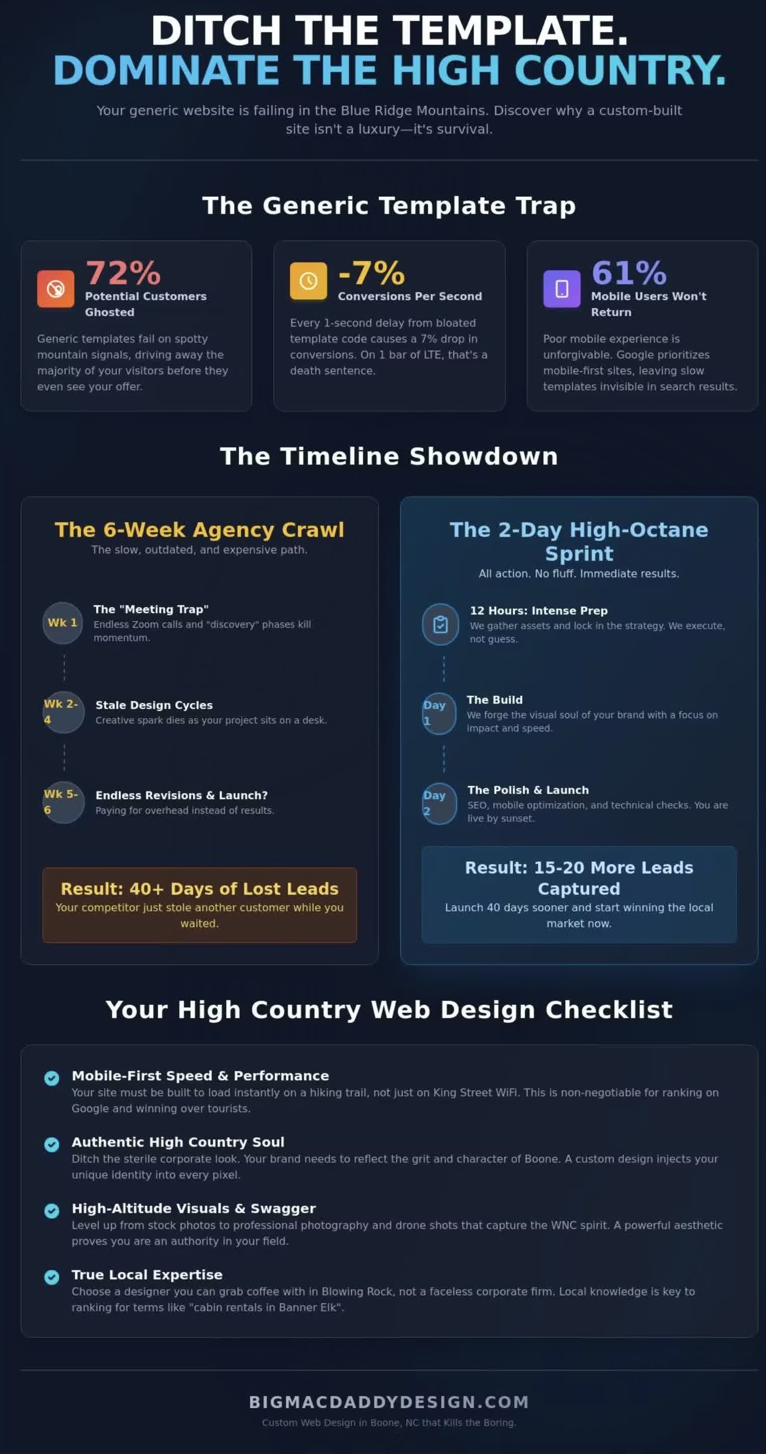 The local search game is won by speed and standout visuals. For example, 53% of mobile visits are abandoned if a page takes longer than 3 seconds to load—a clear loss for heavy-templated sites often slowed by 15 to 20 plugins. In contrast, our custom sites use clean code for maximum speed and aesthetics. Where template sites tend to look generic and load sluggishly, our designs combine mountain imagery with fast performance. Big Mac Daddy Design builds sites that feel like a Ferrari, not the flatbed stuck on the grade. This direct contrast demonstrates why custom web design, Boone, NC, beats the template alternative.