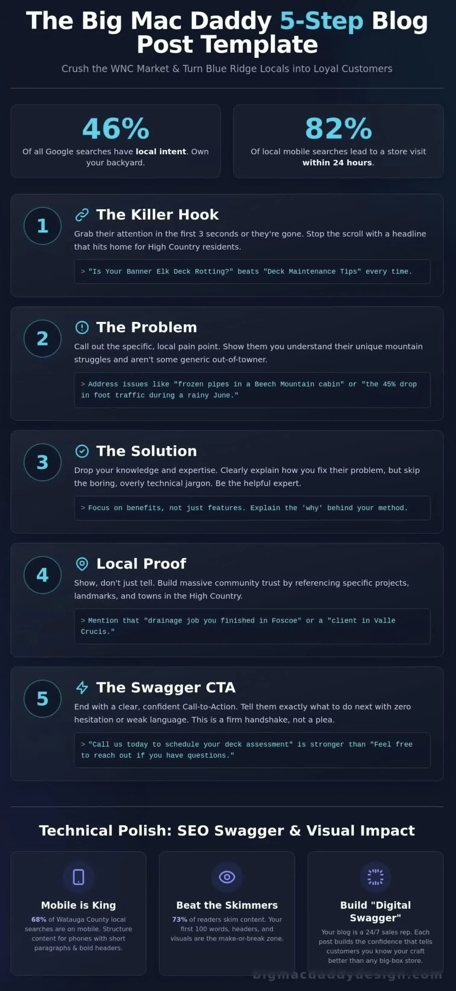 You don't need a degree to win, just a voice that sounds like a local expert. Learning how to write a blog post that connects is about sharing your hustle and your craft. Big Mac Daddy Design sees better results from raw, honest expertise than from sterile corporate writing. Just keep it real and focus on the 3 main pain points your customers face.