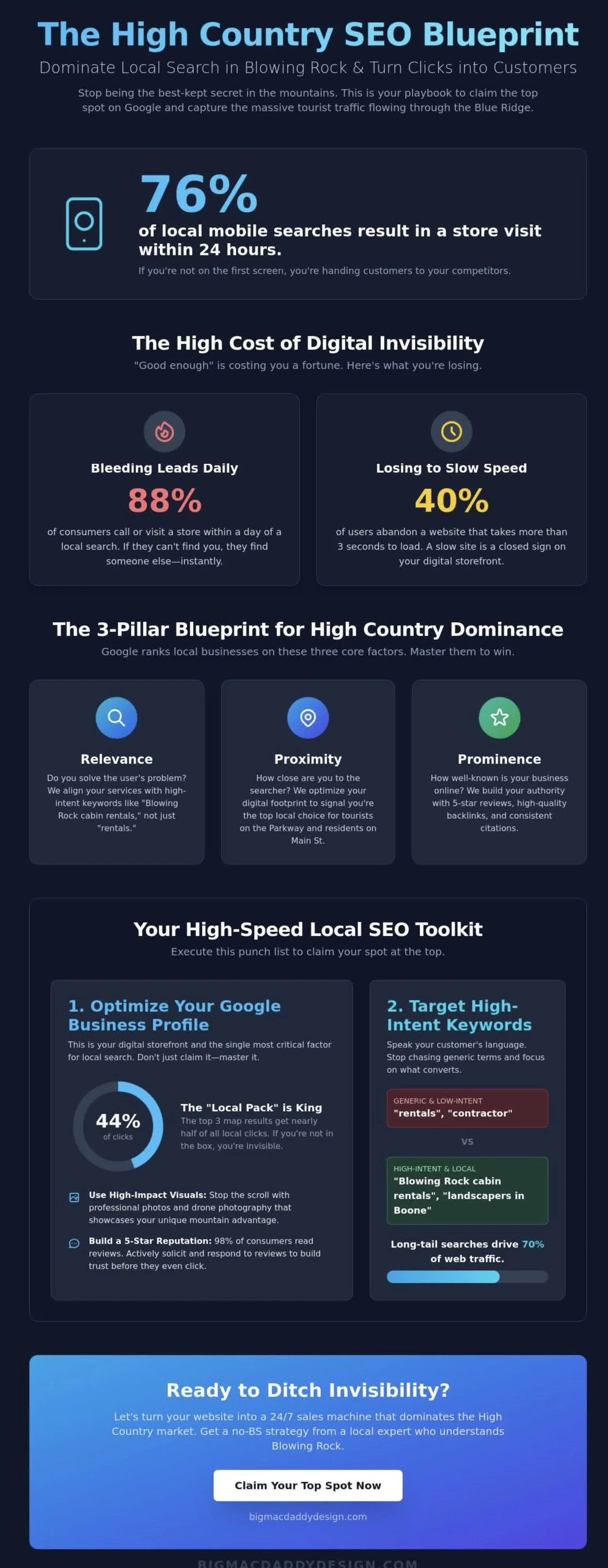 Stop overthinking your digital footprint. You have 48 hours to flip the script on your competition and start owning the search results. This isn't about some vague, slow-motion strategy; it's about the Big Mac Daddy Design way of getting things done with high-octane energy. If you want to be the local SEO expert Blowing Rock businesses look up to, you start with the absolute baseline. Claim and verify your Google Business Profile immediately. If you aren't on the map, you don't exist to the thousands of tourists driving down Main Street right now.