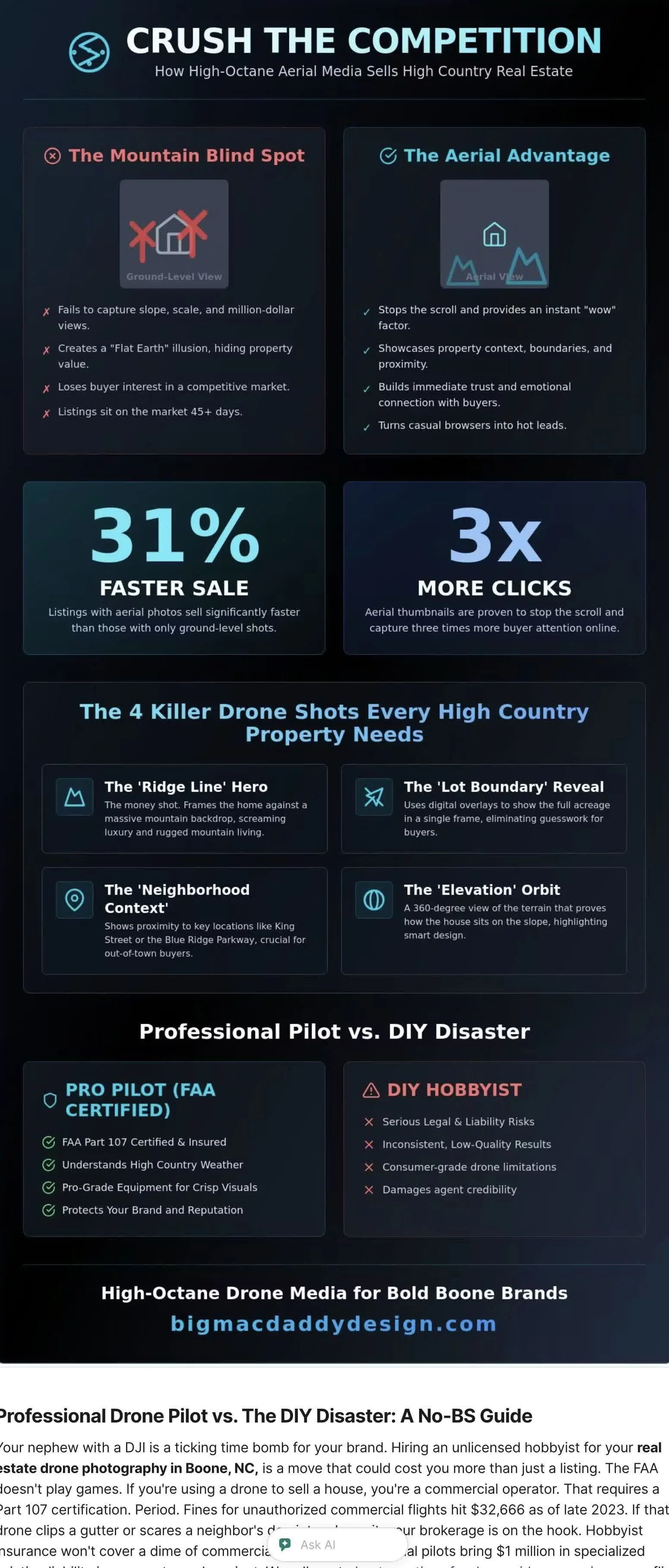 Most agencies treat a drone like a glorified tripod in the sky. We don't. At BigMacDaddy Design, we don't just take photos; we create a visual movement for your listing. We capture the raw energy of the High Country, turning a standard property view into a cinematic experience. Your listing isn't just a house on a hill; it's a vibe. We focus on the flow of the land and the way the light hits the Blue Ridge peaks at 6:00 AM.