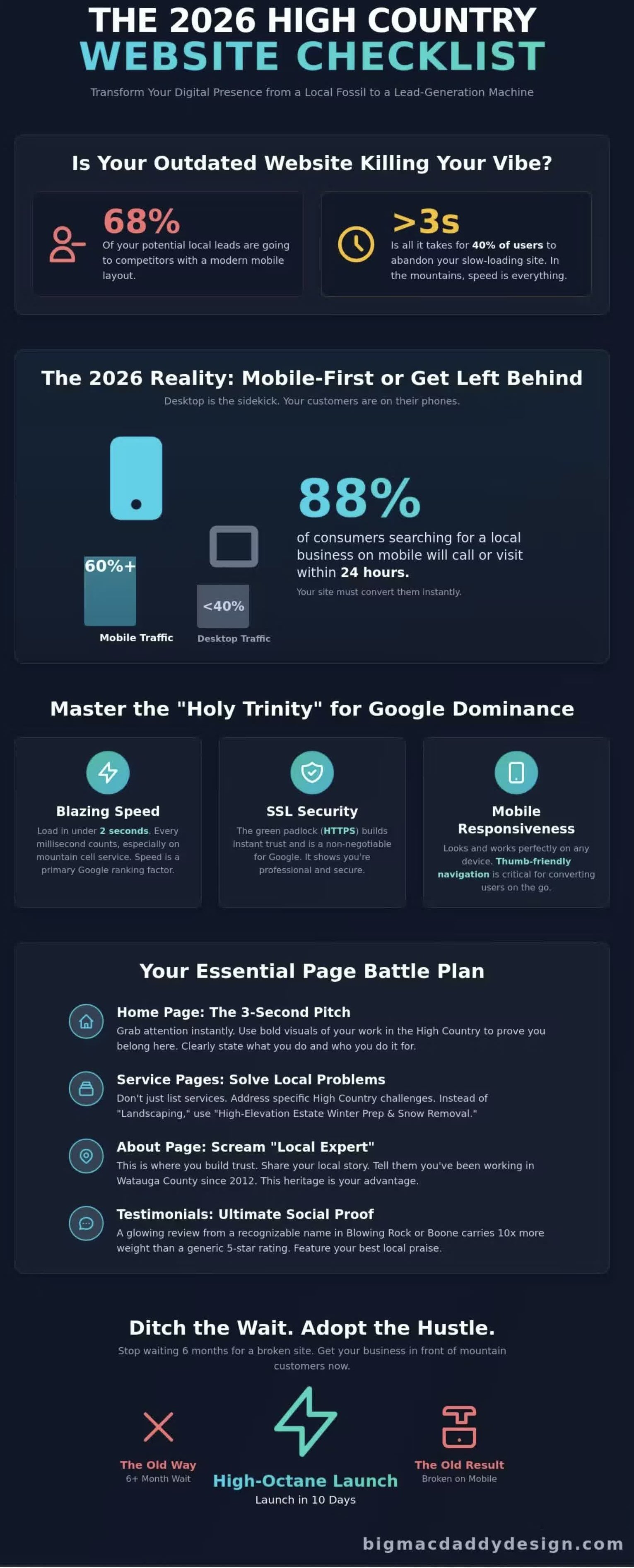 Boone is buzzing. It is 2026, and the mountain charm of the High Country does not excuse a clunky, outdated website. If your site looks like a digital fossil, you are literally handing cash to your rivals in Blowing Rock. Recent data shows that 88% of consumers who search for a local business on a mobile device call or visit that business within 24 hours. If your page doesn't load instantly, those customers are gone. This small business website checklist starts with one hard truth: "good enough" is a lead killer. You cannot afford to settle for a site that feels like a relic from the dial-up era.